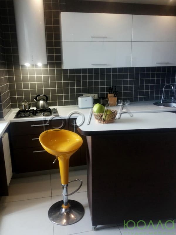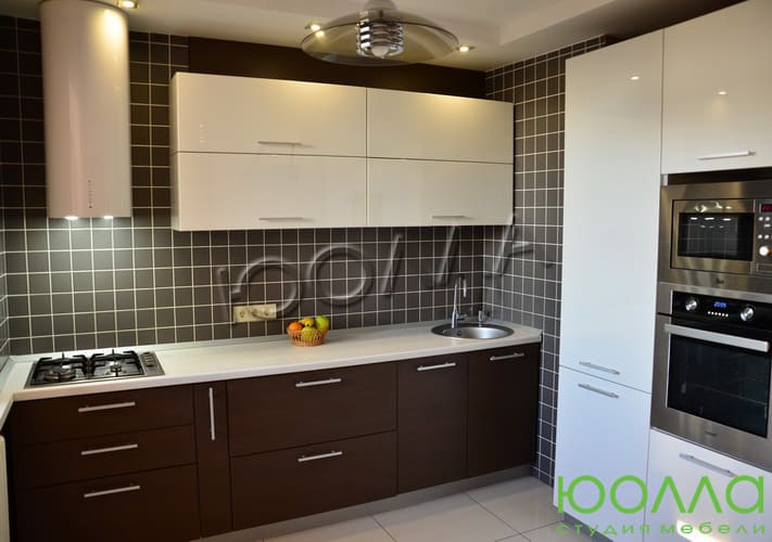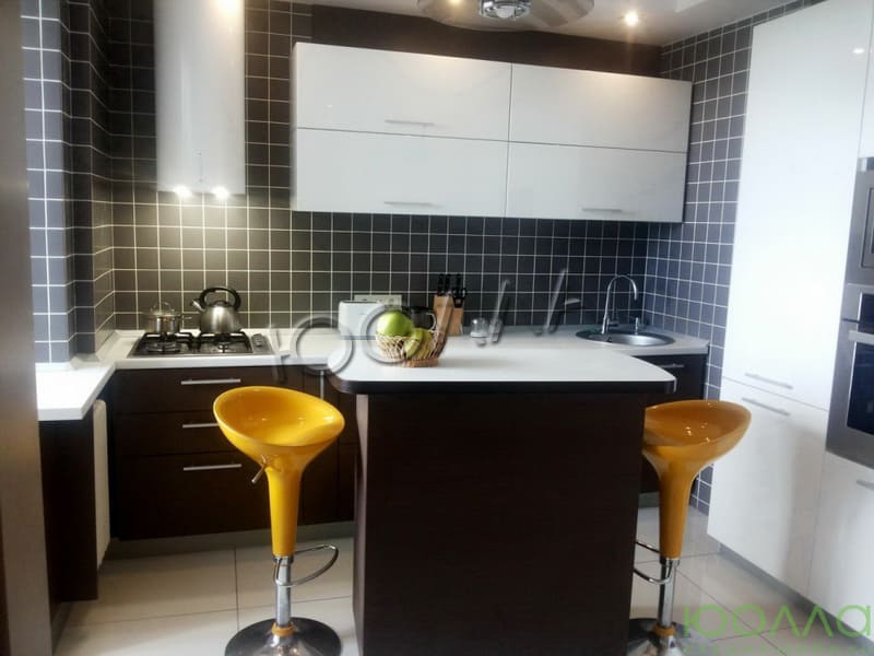 Кухня «Ольга» выполнена в контрастном исполнении темно-коричневого и белого цветов. Яркой ноткой в дизайне служат современные кухонные стулья оранжевого цвета. Данная модель комплектуется передвижной стойкой. Кухня изготовлена со скрытыми креплениями и фурнитурой по немецкой технологии "Фолдинг".