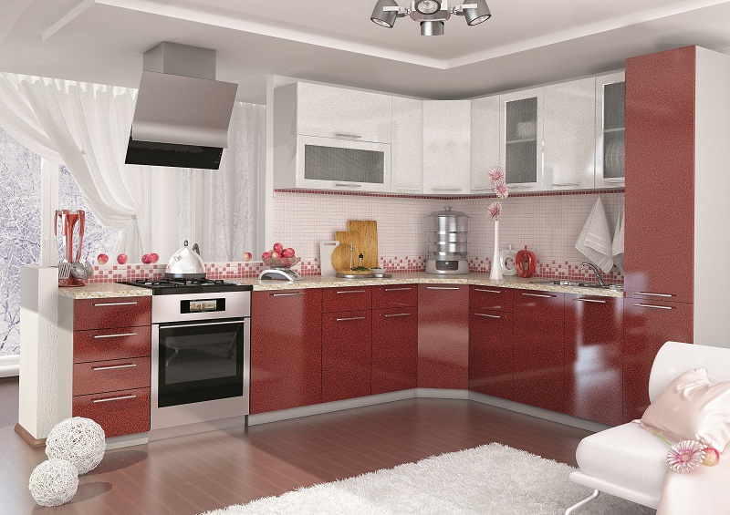 Глянцевые фасады с зернистой фактурой: красный низ и белый верх. В торце изготовливается шкаф для встроенного холодильника. Некоторые ниши навесного модуля в матовом рамном остеклении. Угол с диагональными дверцами. Фасады с длинными прямоугольными ручками.