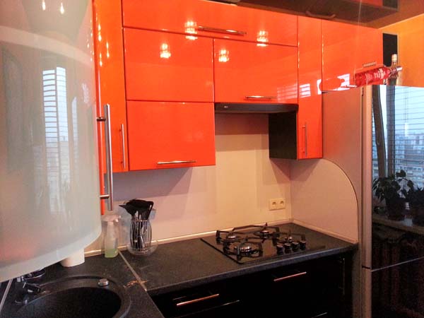 Компактная угловая кухня с глянцевыми фасадами