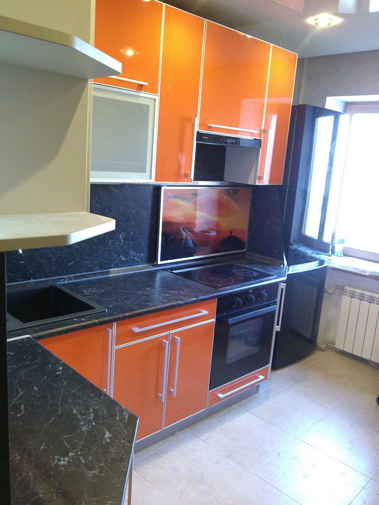 Красочный угловой гарнитур станет достойным украшением вашей кухни. Яркие оранжевые фасады создадут теплую обстановку в интерьере и с легкостью поднимут настроение даже в самый хмурый день. Черная благородная столешница и фартук повторяют текстуру камня и удачно оттеняют красочное оформление.