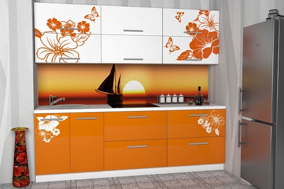Кухня окрашена в бело-оранжевую гамму цветов, которая сразу объединяет в себе лаконичность и яркость. Расцветка кухни создаст творческую атмосферу для готовки. Шкафчики оборудованы тонкими изящными ручками.