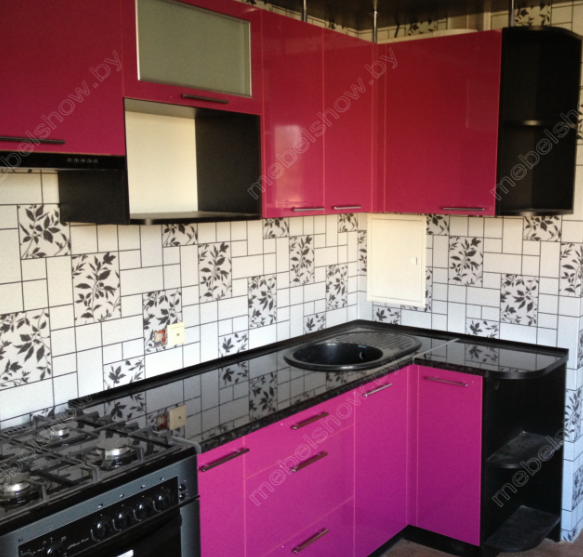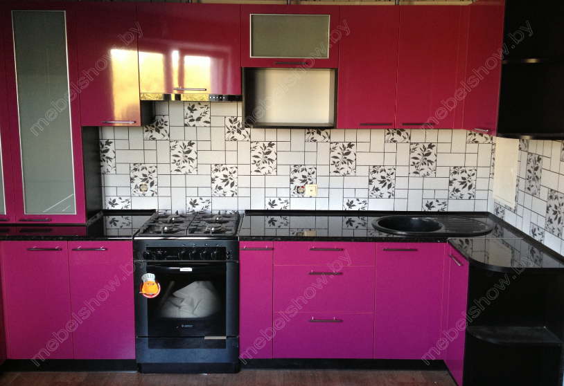 код 82436Малиновые и розовые фасады в сочетании с черной глянцевой столешницей и матовыми торцами.