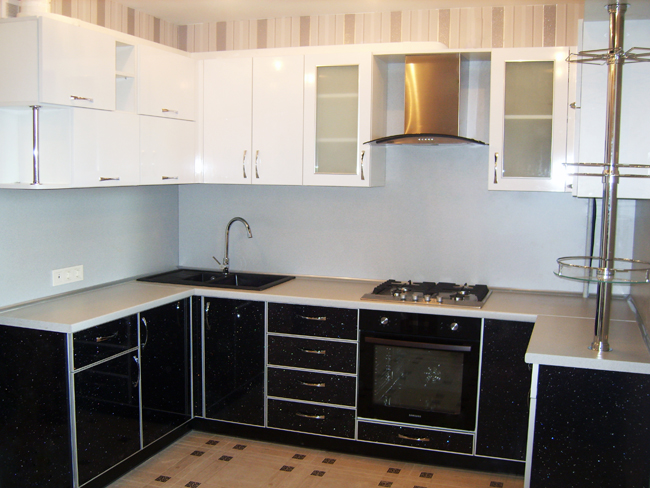 П-образная кухня создает больше простора для кулинарного творчества за счет вместительной столешницы. Контрастные фасады выполнены в глянце, напольные модули декорированы блестящими точками, которые отсылают к тематике звездного неба. Кухонная фурнитура в виде ручек отличается простотой и элегантностью.