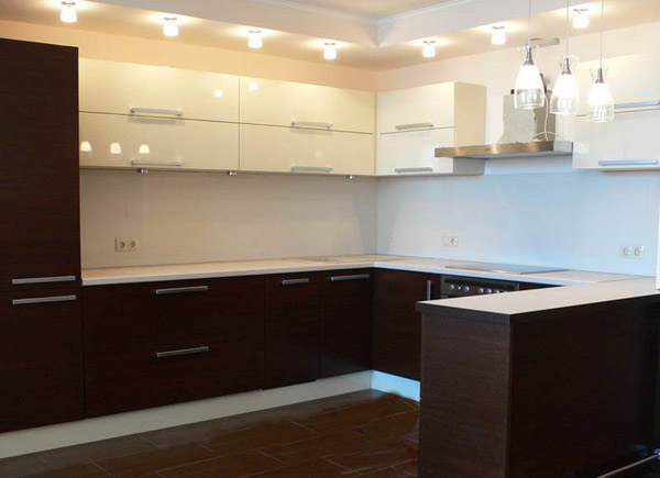 Кухня имеет П-образную конструкцию, что обеспечит комфортную работу, так как все необходимые предметы будут под рукой. Фасады исполнены в гармоничном сочетании цвета венге и кремового. Рабочая зона оборудована светильниками.