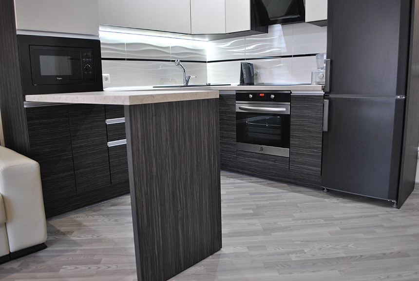Кухня П-образной формы оснащена светодиодной подсветкой, создающей дополнительное освещение рабочей поверхности. Барная стойка, входящая в кухонный гарнитур, увеличивает рабочую поверхность и обеспечивает уютное обеденное место, что немаловажно на кухнях небольшой площади.