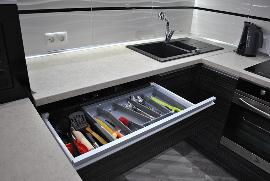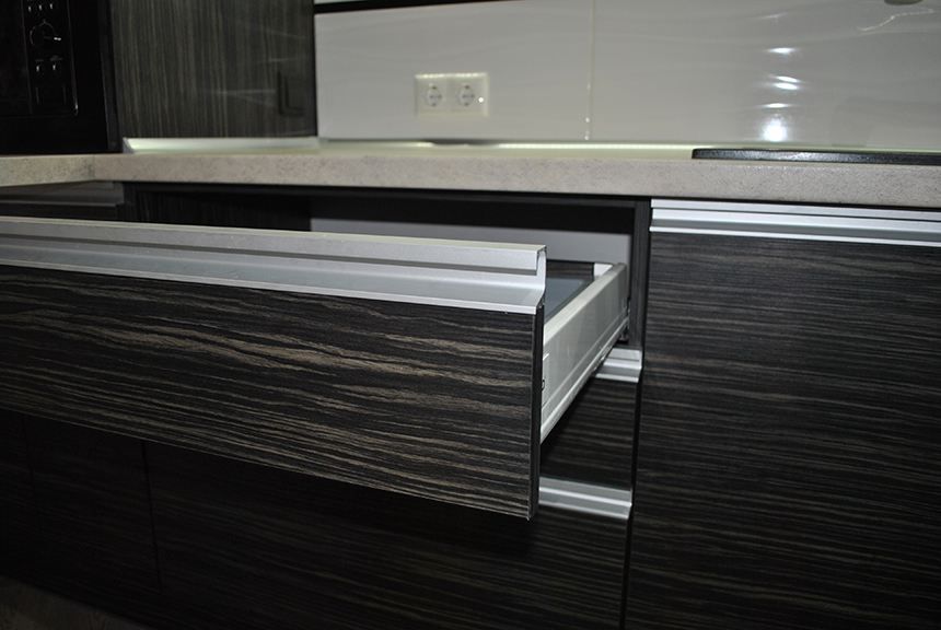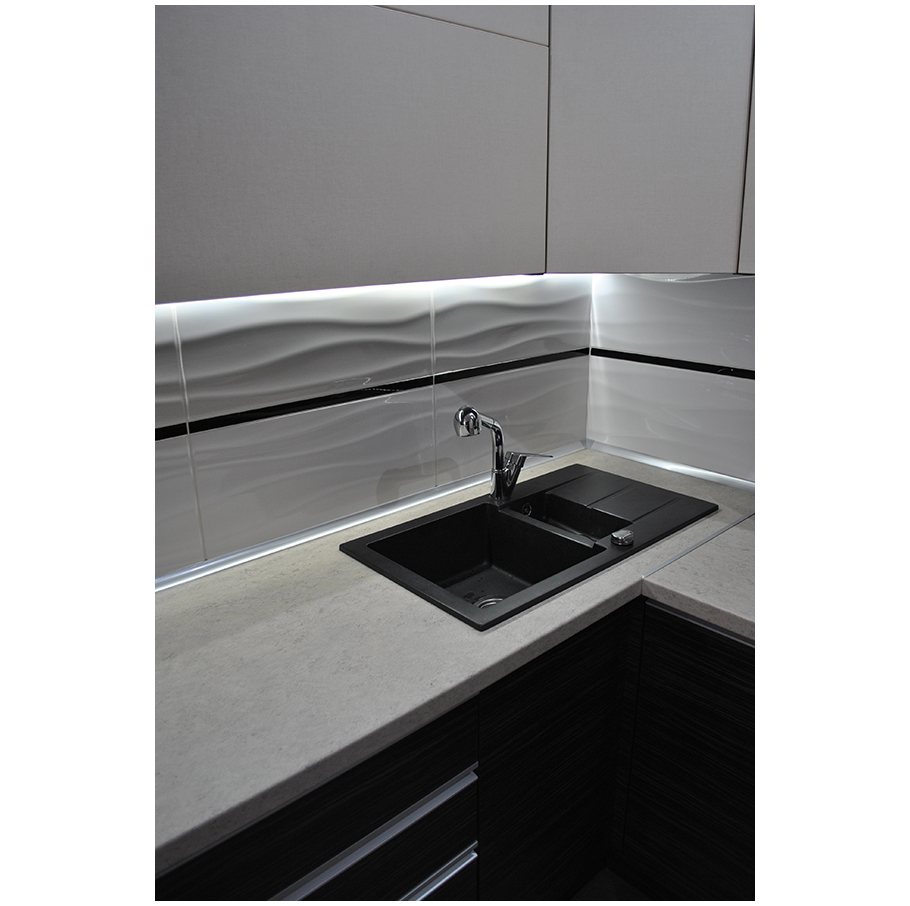 Фасады верхних шкафов кухни изготовлены из пластика ARPA, нижних – из ЛДСП Egger. Все детали корпуса и фасадов оклеены кромкой ПВХ толщиной 2 мм. Цоколь конструкции выполнен в цвет нижних фасадов. Вся фурнитура Hettich (Германия), используемая при производстве модели, отличается высоким качеством и долгим сроком службы.