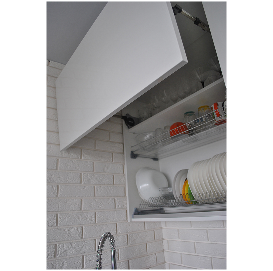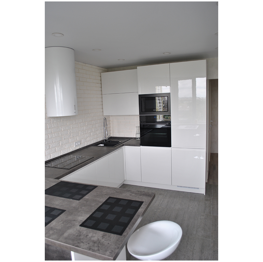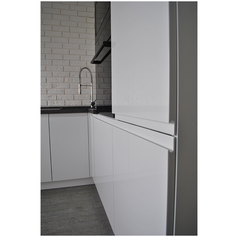 Кухня П-образной формы оснащена фасадами из крашенного глянцевого МДФ с фрезеровкой под ручки. Каркас конструкции выполнен из ЛДСП Egger и оклеен кромкой ПВХ толщиной 2 мм.