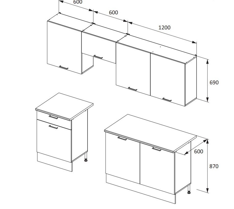 Размеры верхних шкафов (Ш*В): 2400х690 мм (ширина шкафов - 600 + 600 + 1200 мм)