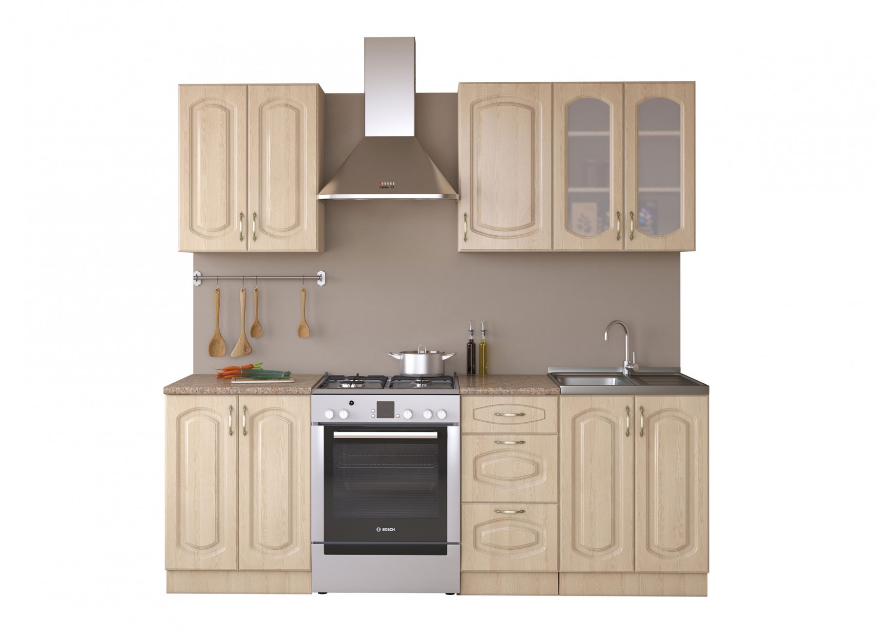 код 104627Кухня в светлых тонах с фрезеровкой фасадов. Ширина модулей 1600 мм.