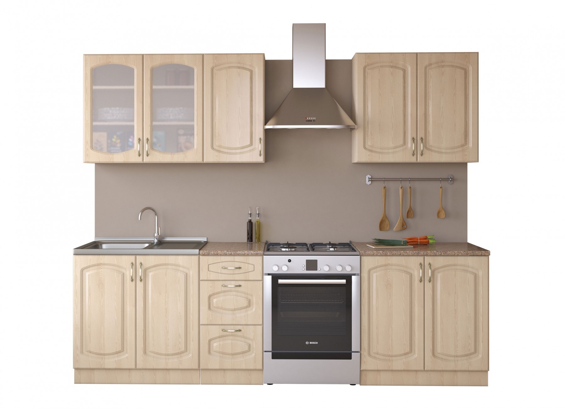 Однотонный древесный цвет фасадов из ЛДСП. Ширина кухни 180 см.