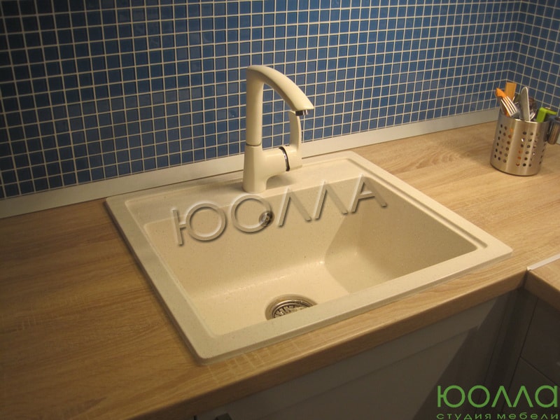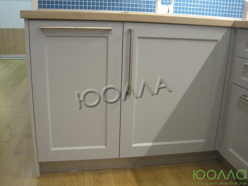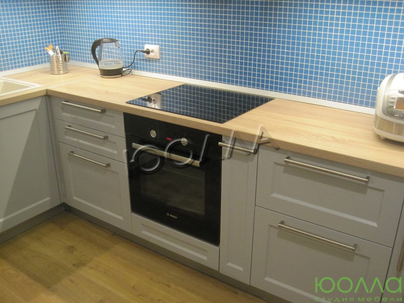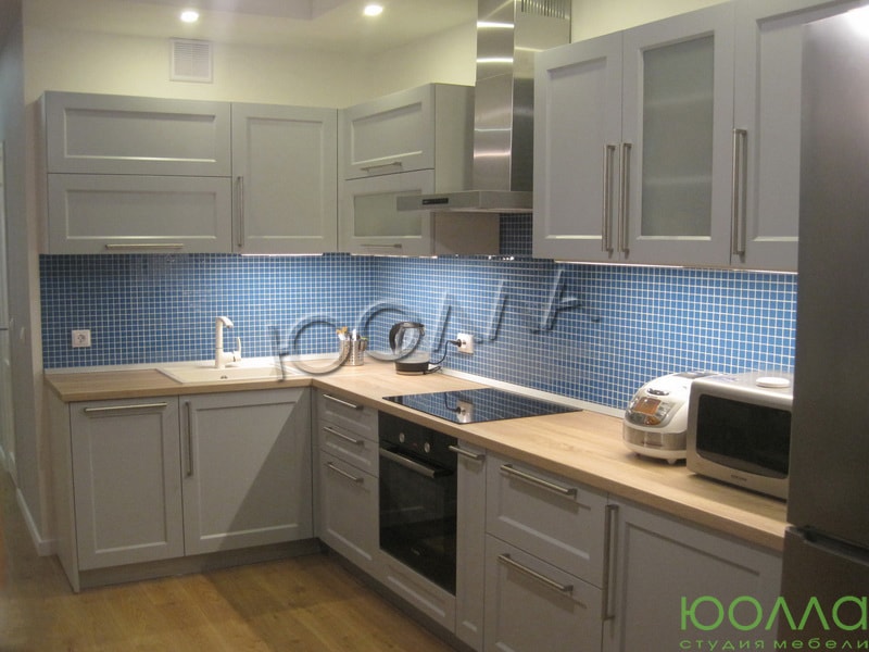 Кухонный гарнитур «Питер», как и культурная столица России, выполнена с «островком». Кухонный фартук выполнен в синем цвете под мозаику. Светлые фасады удачно сочетаются со столешницей под светлое дерево. Кухня изготовлена со скрытыми креплениями и фурнитурой по немецкой технологии "Фолдинг".