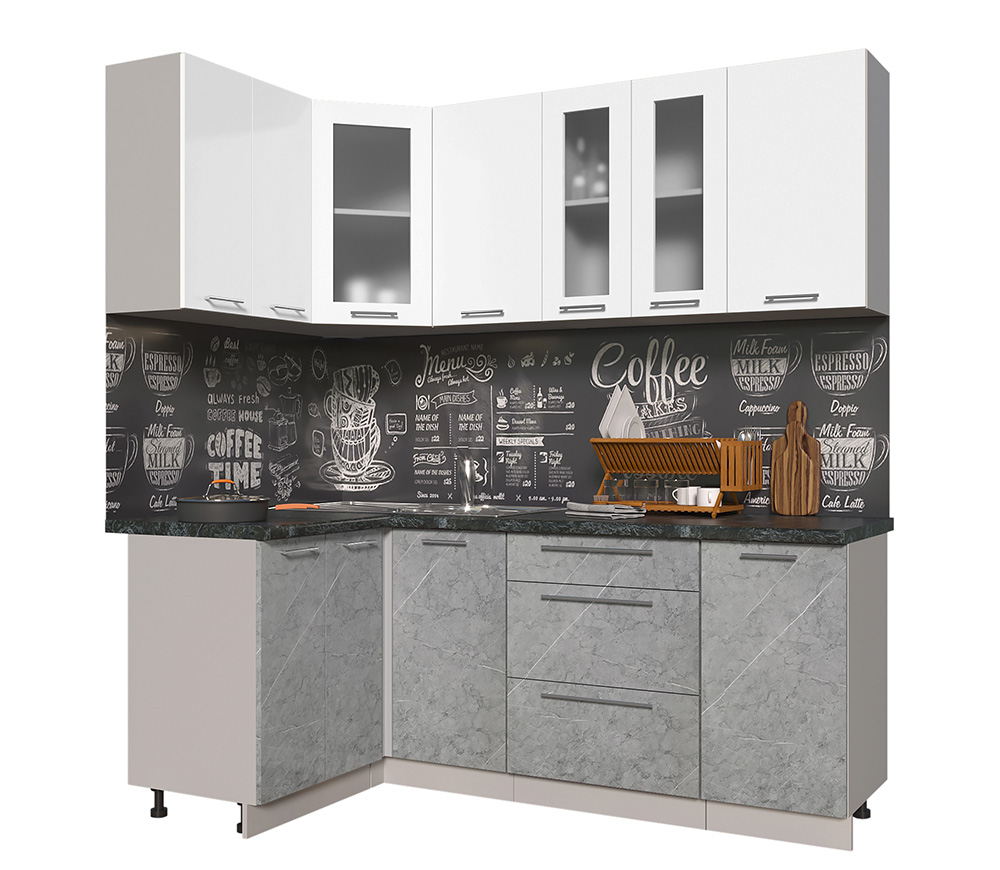 Угловая современная кухня с серыми матовыми фасадами. Материал: ЛДСП.