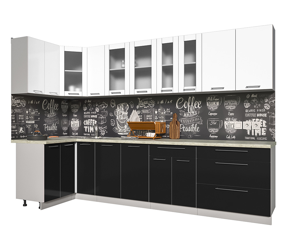 Светлая столешница под мрамор, черные стекла и матовые ручки.