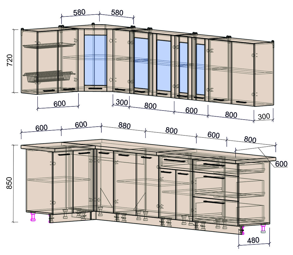 Материал фасада и корпуса: ЛДСП 16 мм. Ширина кухни 150 см.