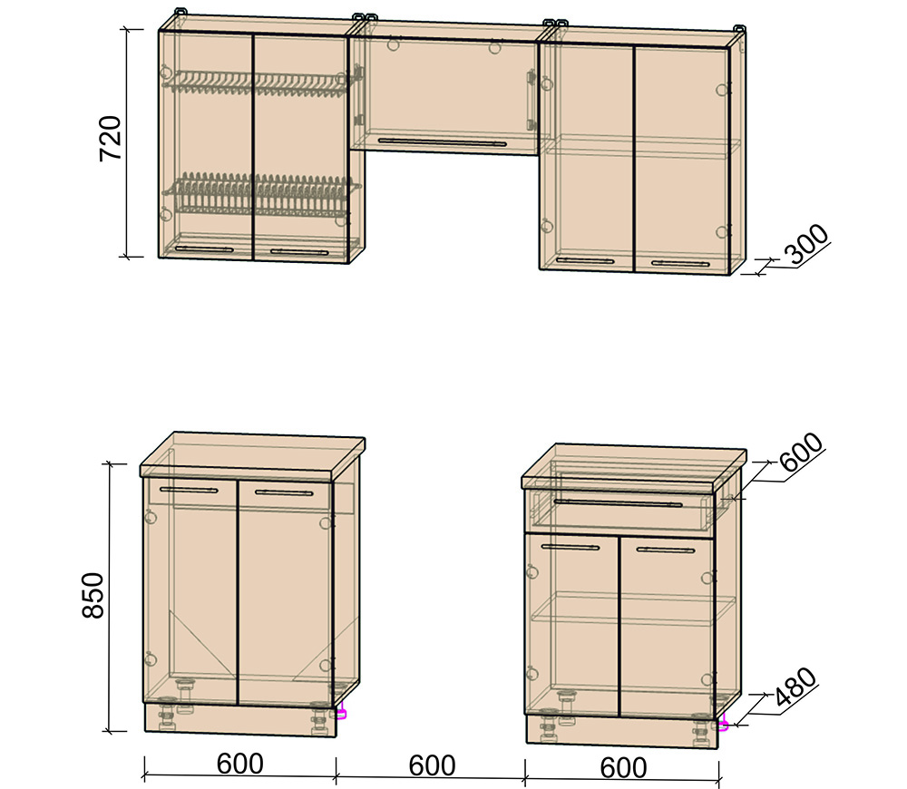 Материал фасада и корпуса: ЛДСП 16 мм. Ширина кухни 200 см.