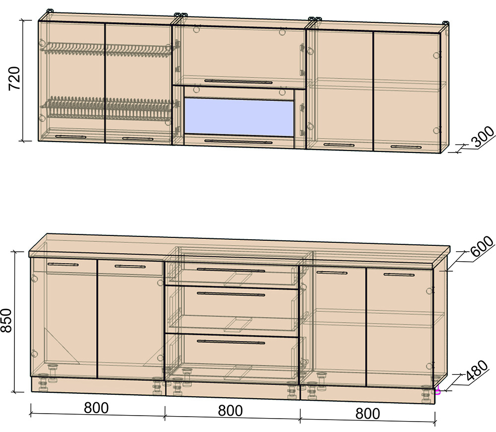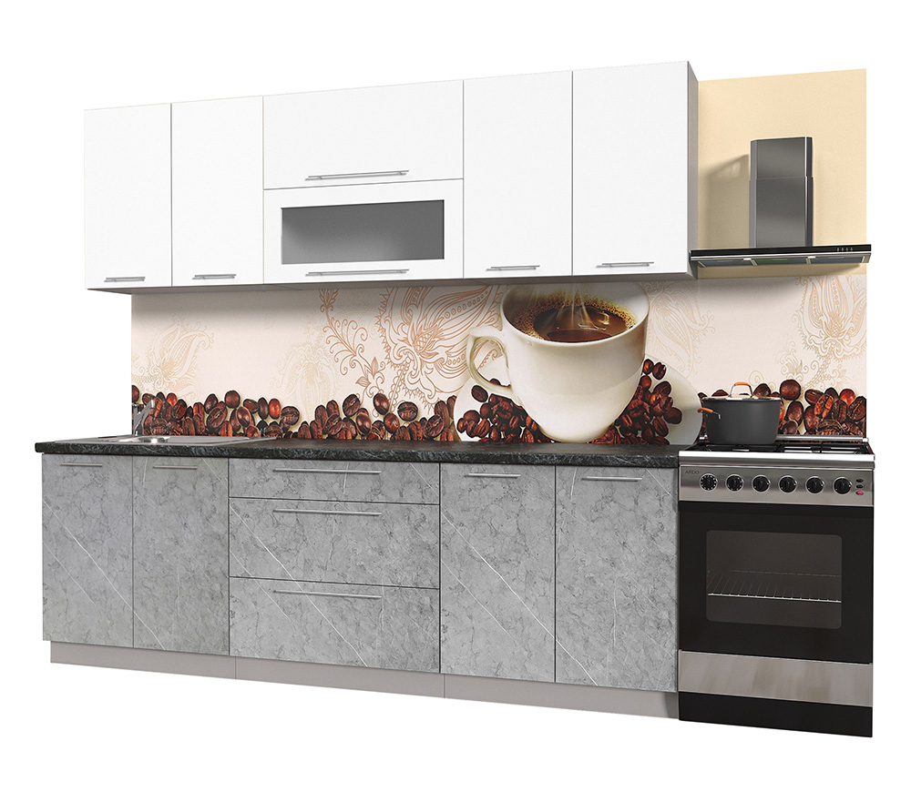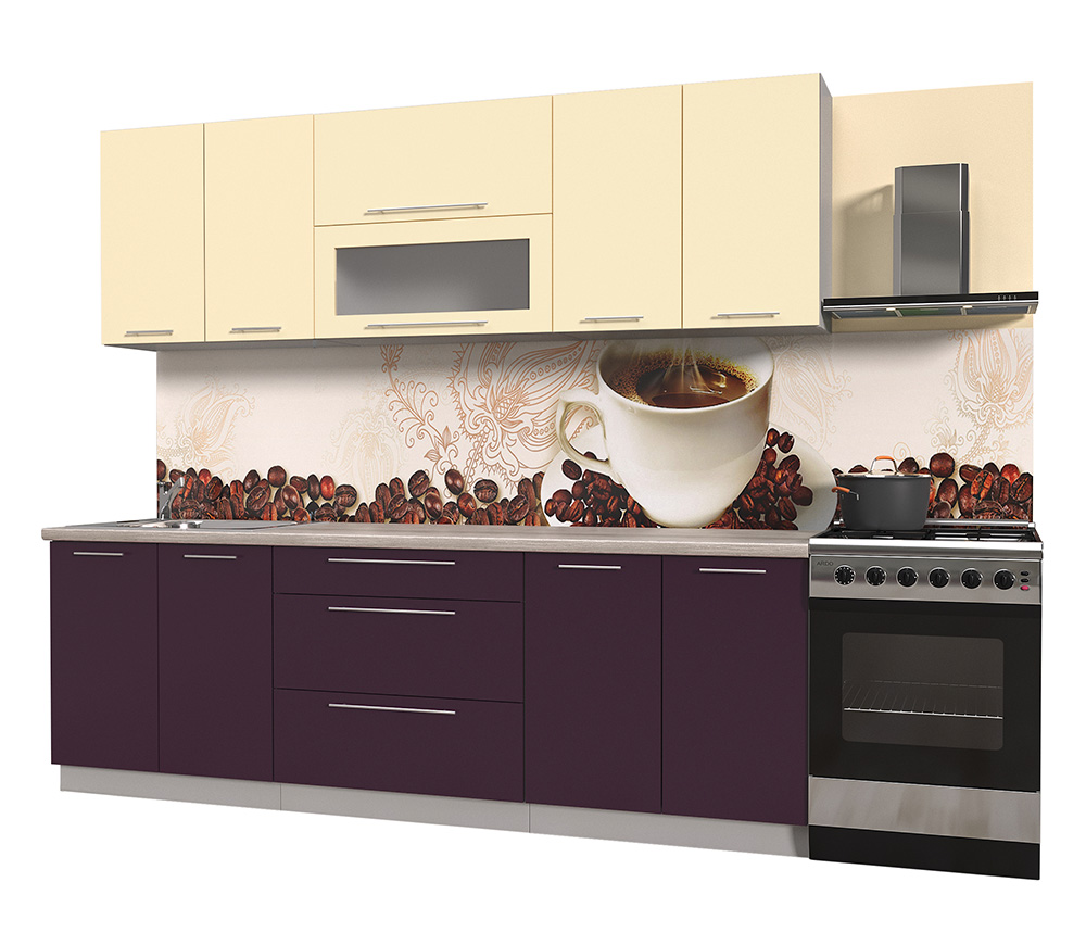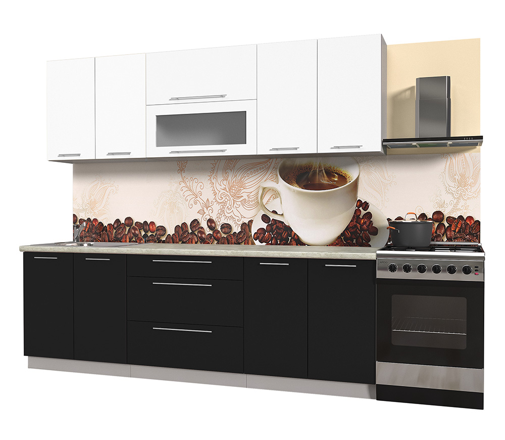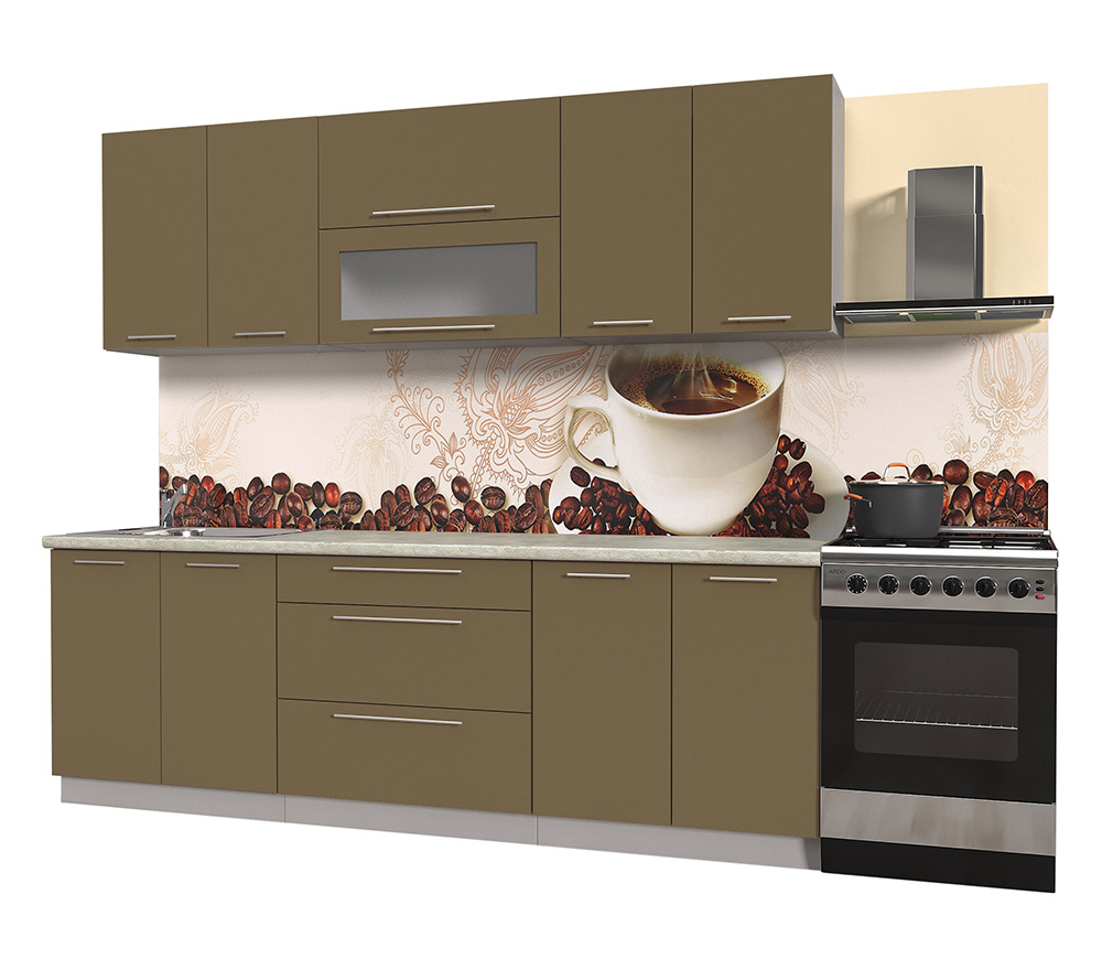 Верхние фасады со стеклом. Ширина кухни 250 см.