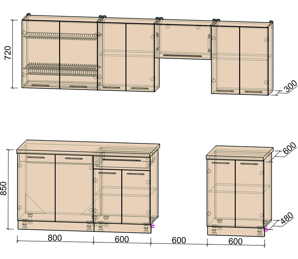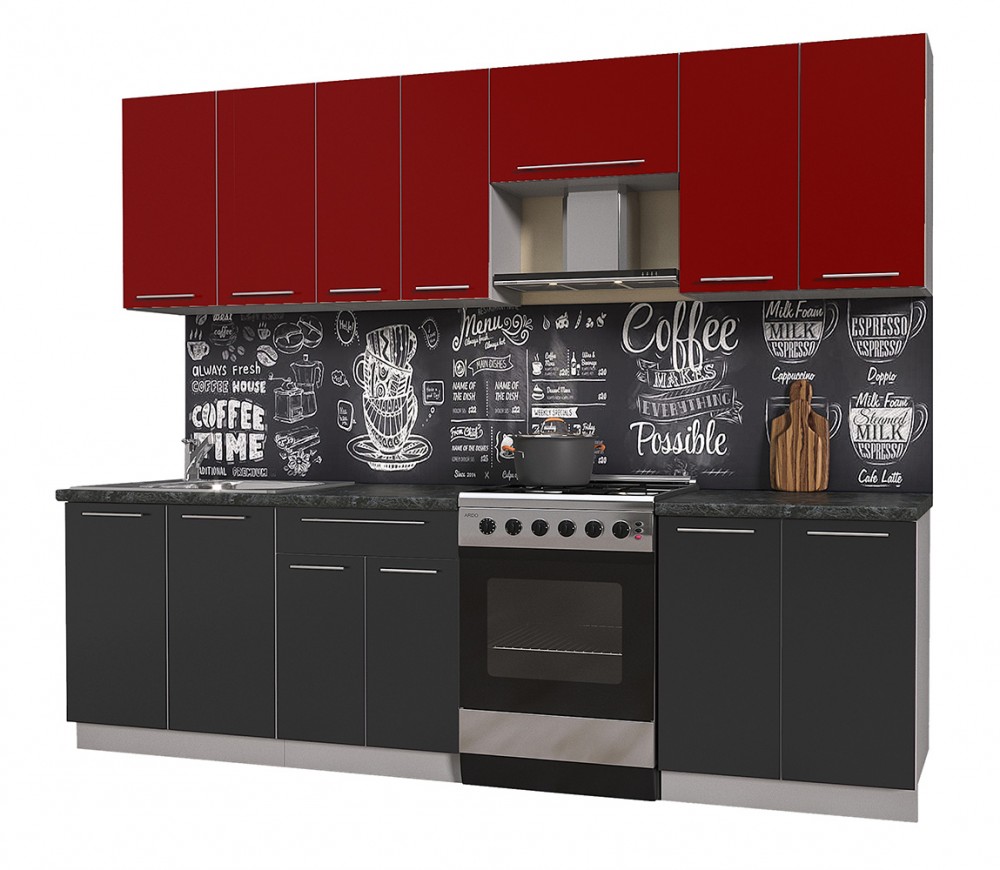 Материал фасада и корпуса: ЛДСП 16 мм. Ширина кухни 220 см.
