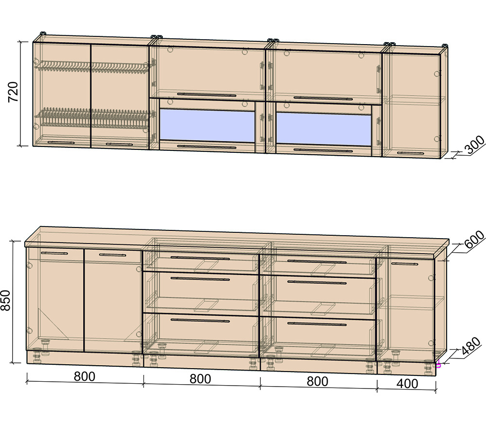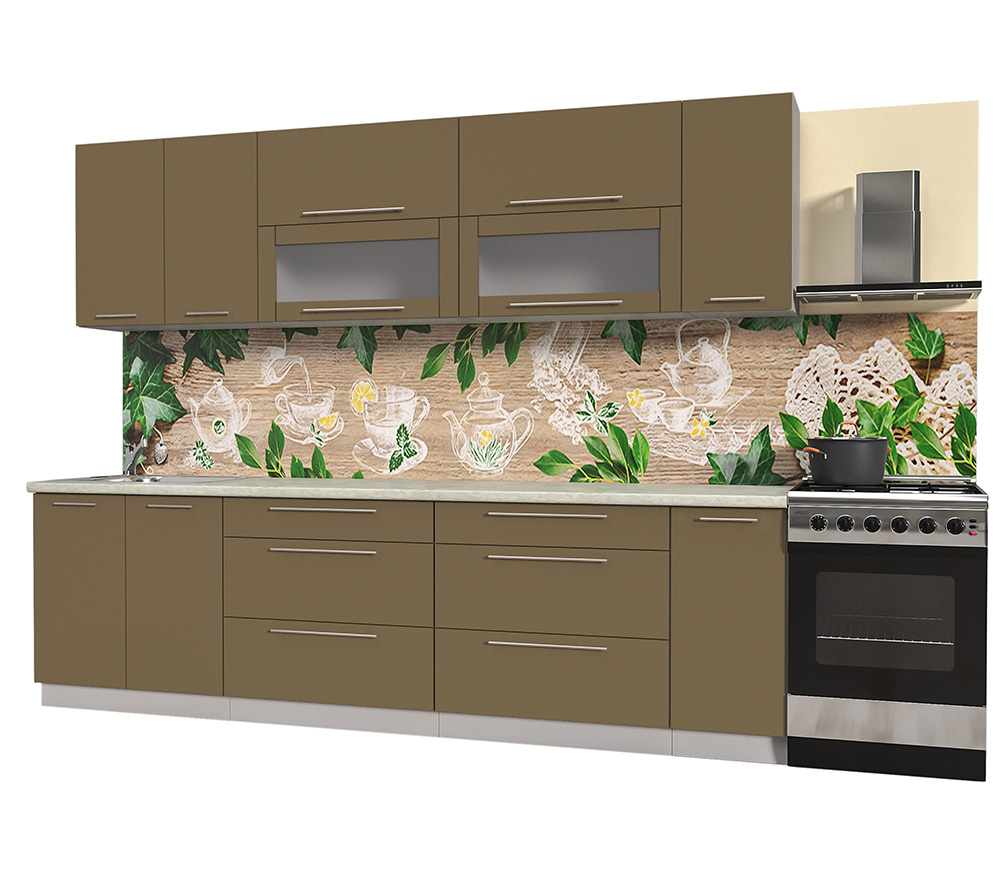 Материал фасада и корпуса: ЛДСП 16 мм. Ширина кухни 230 см.