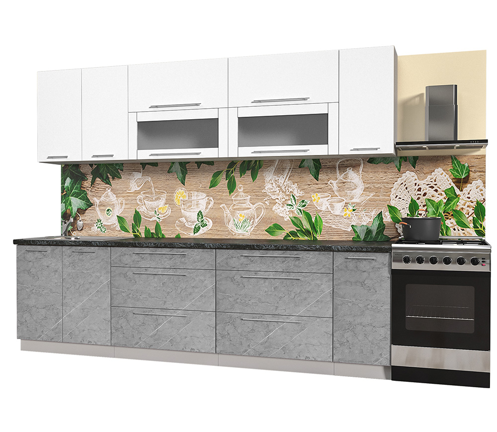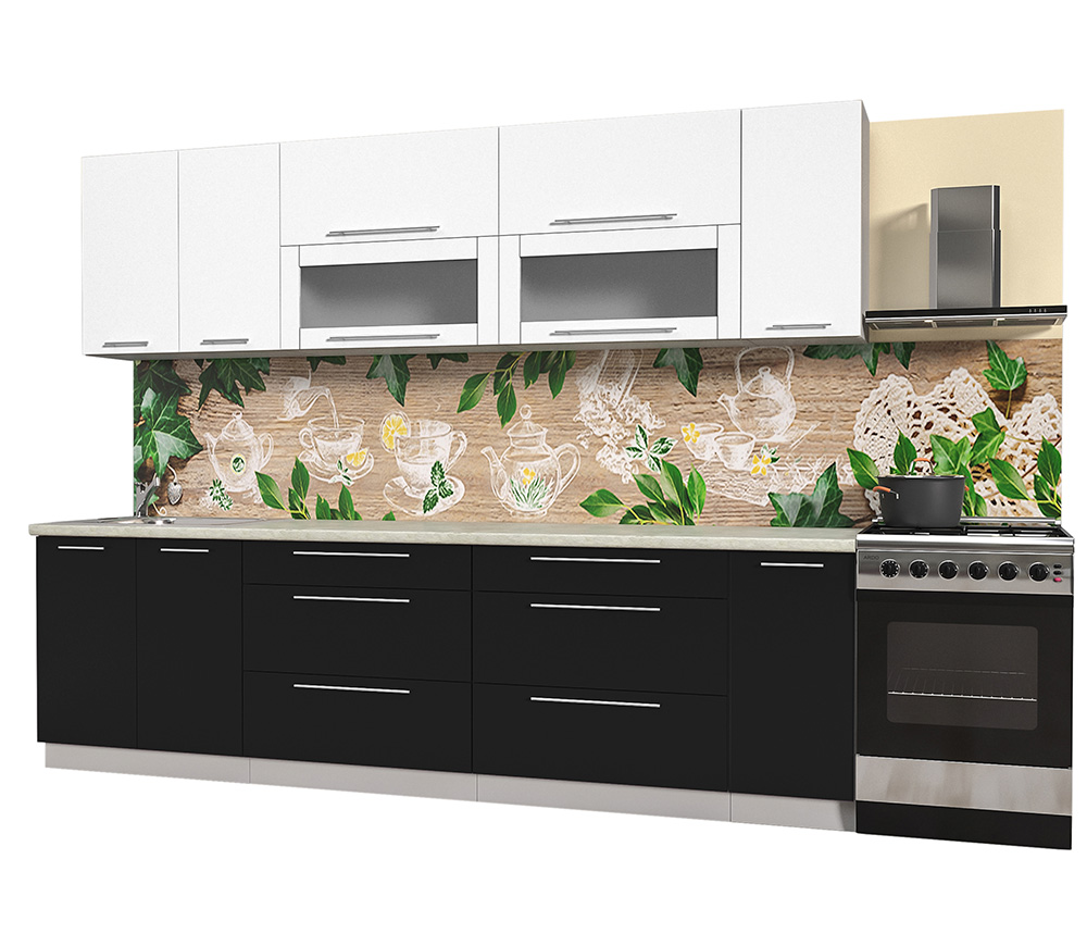 Скинали с фотопечатью, глянцевые фасады, хромированные ручки.