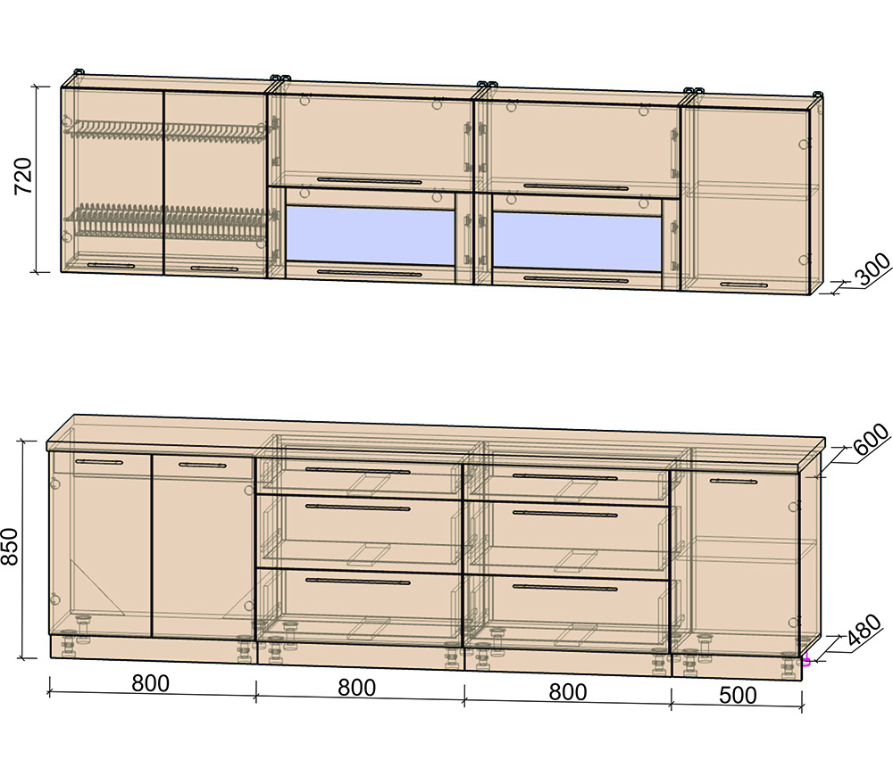 В комплекте 3 напольных и 3 навесных шкафа шириной 60 см.