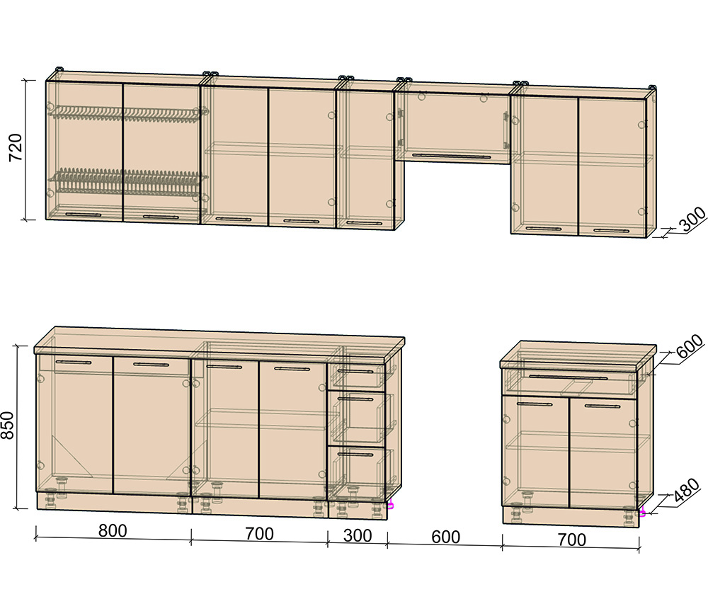 Материал фасада и корпуса: ЛДСП 16 мм. Ширина кухни 260 см.