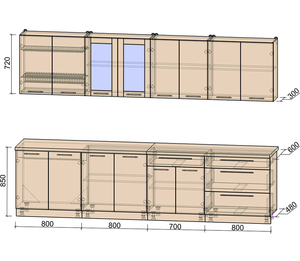 Материал фасада и корпуса: ЛДСП 16 мм. Ширина кухни 240 см.