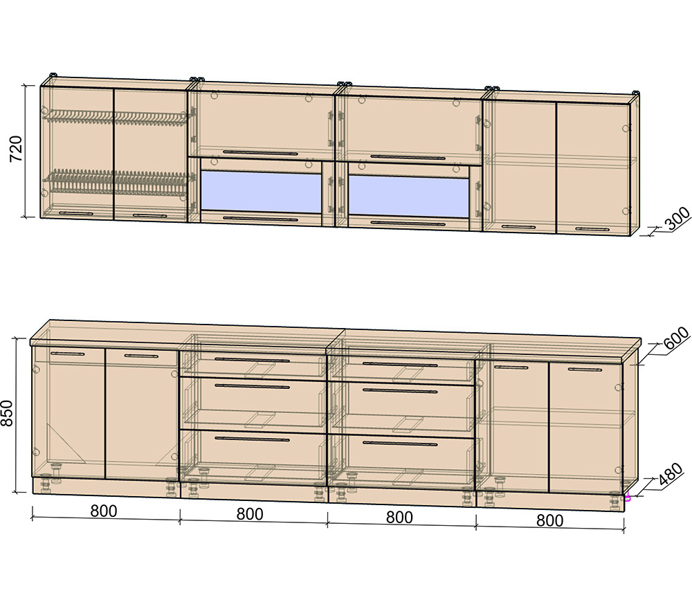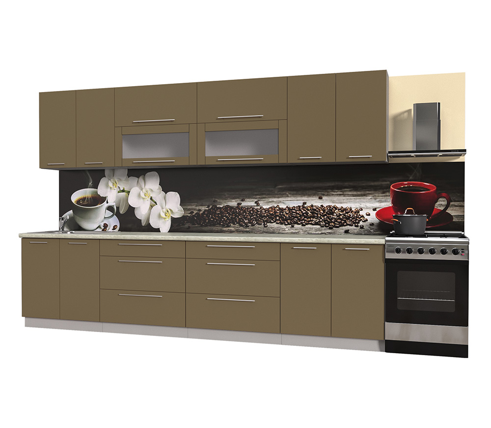 Материал фасада и корпуса: ЛДСП 16 мм. Ширина кухни 210 см.