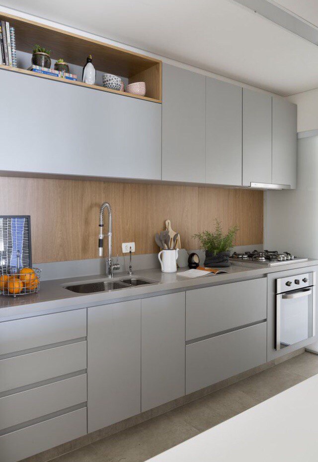 Современная кухня в комбинации салатового и серого цветов фасадов.