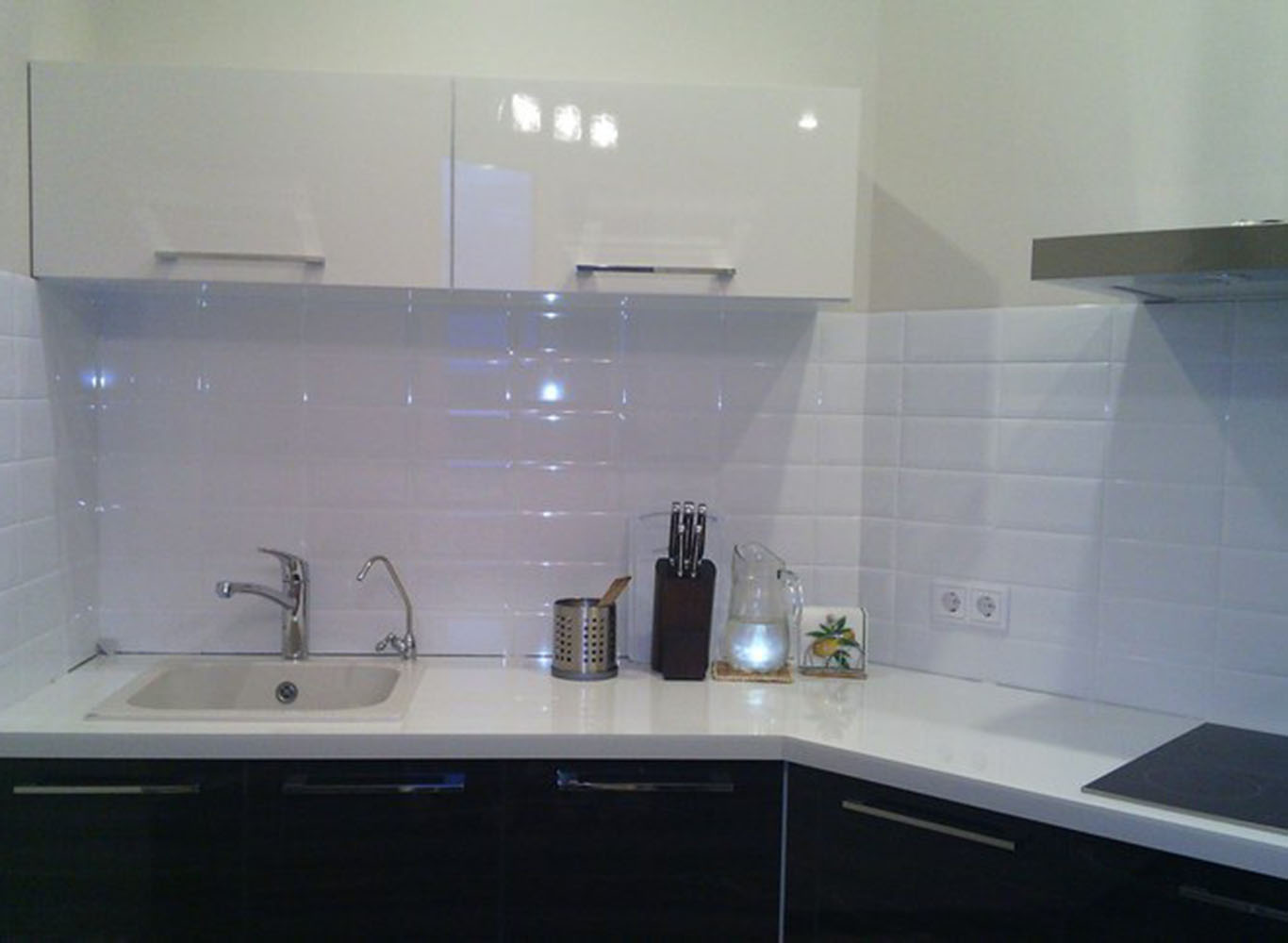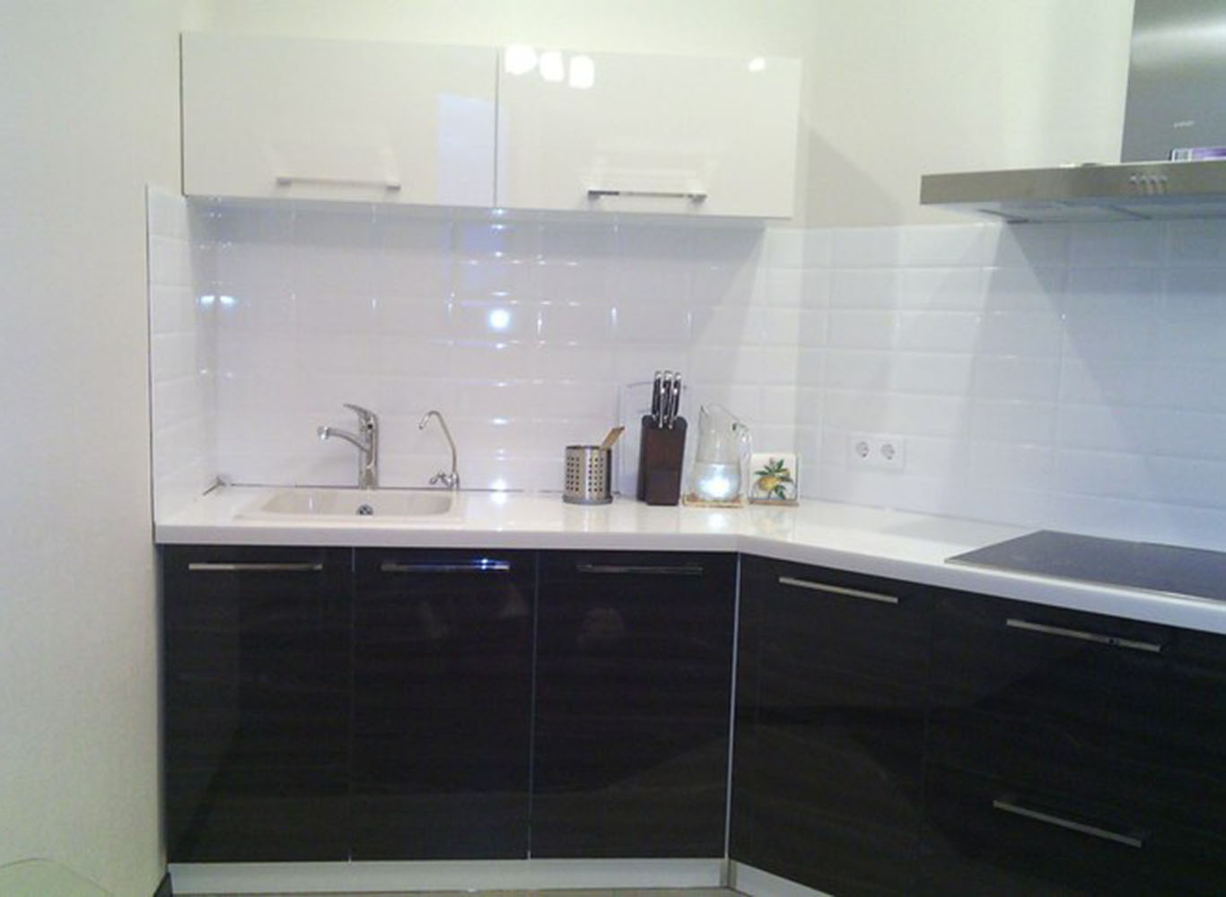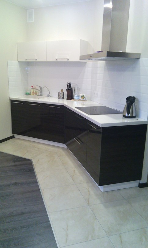 Оригинальная угловая кухня в контрастной расцветке. Комбинированные фасады.
