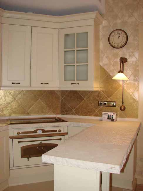 П-образная кухня премиум-класса характеризуется использованием элитных материалов изготовления и отделки. Модель выполнена из натурального массива ольхи и эмалирована специальным защитным составом бежевого цвета. Последний защищает элементы гарнитура от воздействия высоких температур и влаги.