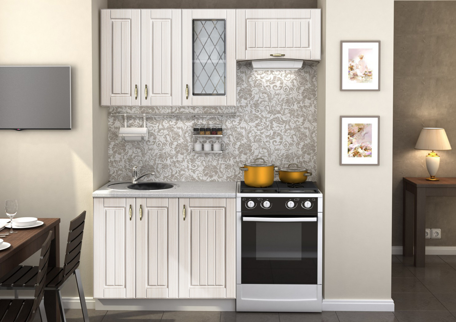 Линейная кухня из ламинированной ДСП и прочного МДФ с оформлением в стиле «прованс» с декорированными ручками шкафчиков, отделением под вытяжку и место для встраиваемой мойки. Все элементы имеют единый стиль и гармонируют друг с другом.