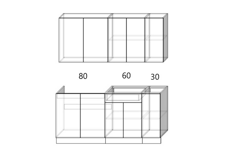 - Глубина нижних шкафов: 600 мм (по корпусу – 480 мм).
