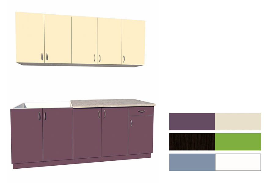 На главном фото изображена кухня в цвете «виола - ваниль», модель также доступна в расцветках «венге - зеленая мамба», «капри синий - белый».