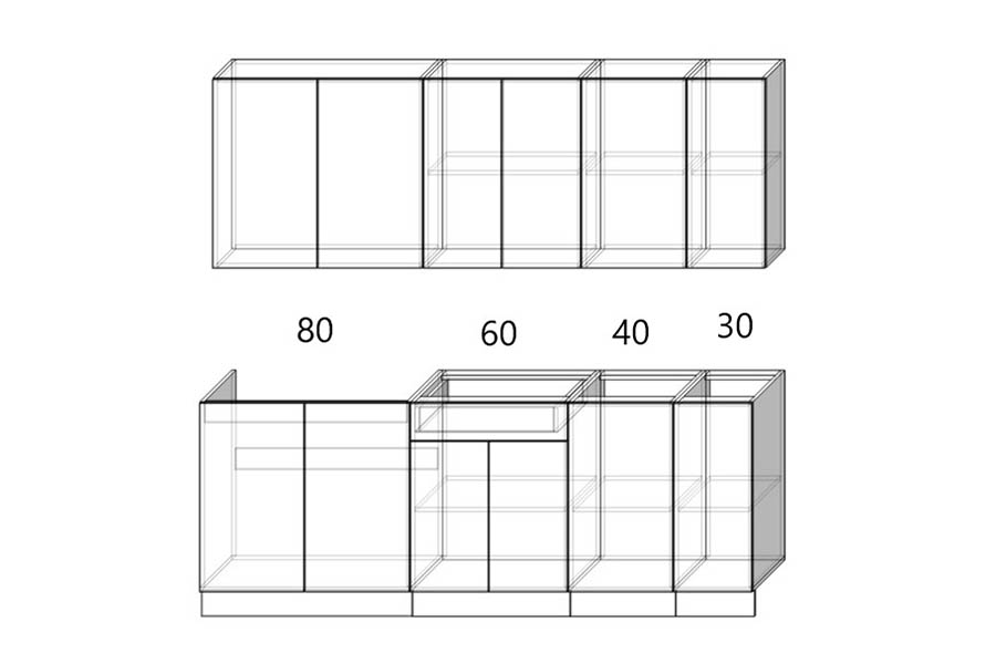 - Глубина нижних шкафов: 600 мм (по корпусу – 480 мм).