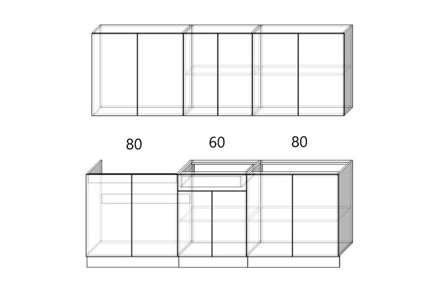 - Глубина нижних шкафов: 600 мм (по корпусу – 480 мм).