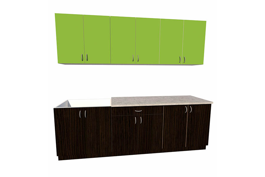 Прямая конструкция, полный комплект из навесных и напольных шкафов.