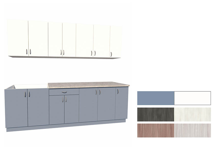 Корпус из белой ЛДСП. Несколько цветов фасадов на выбор.