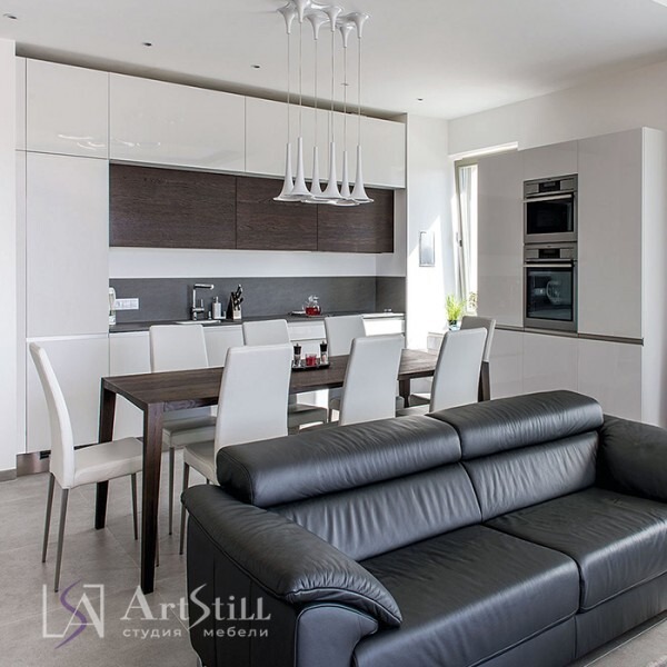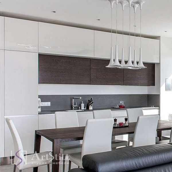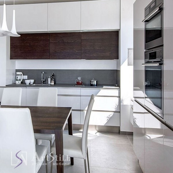 Кухня прямая с пеналами для приготовления и хранения выполнена в «Современном стиле». Кухня под заказ выполнена по дизайнерскому проекту.