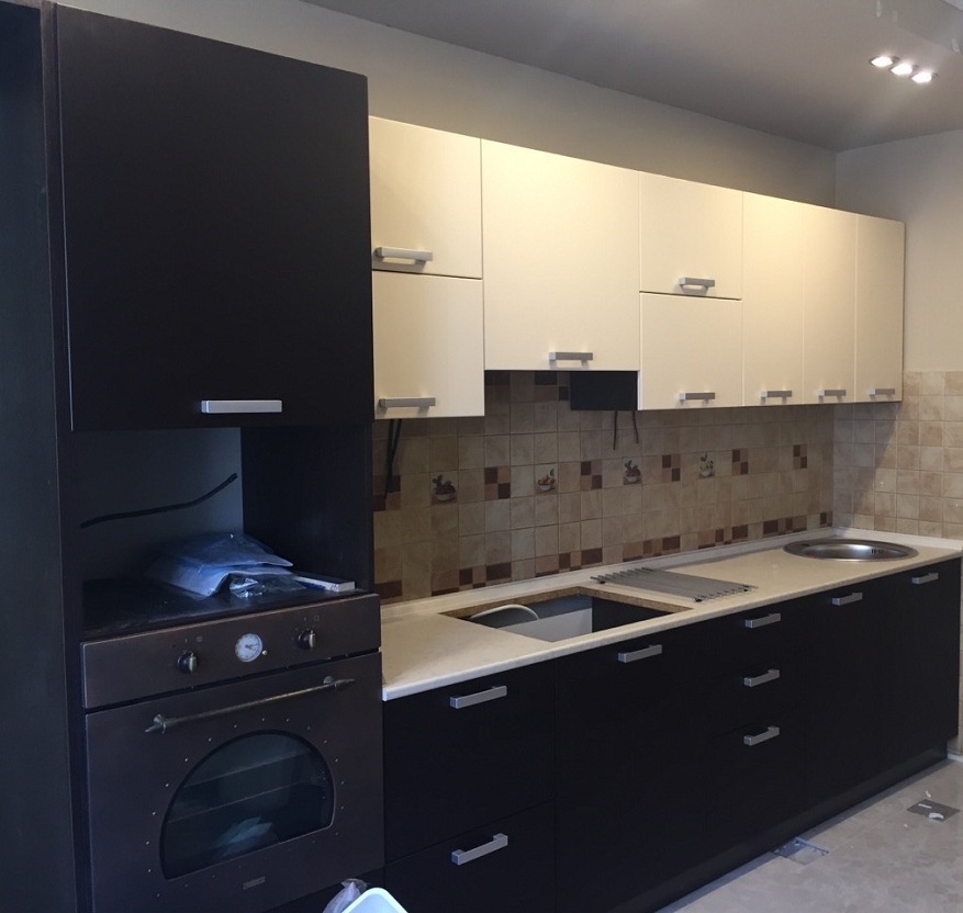 Прямая кухня исполнена в гармоничном сочетании черного и белого цветов. Предусмотрено большое количество модульных элементов для различного рода кухонной утвари.