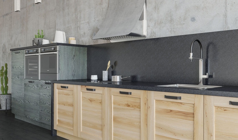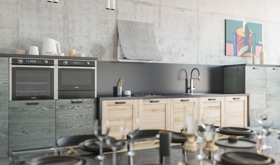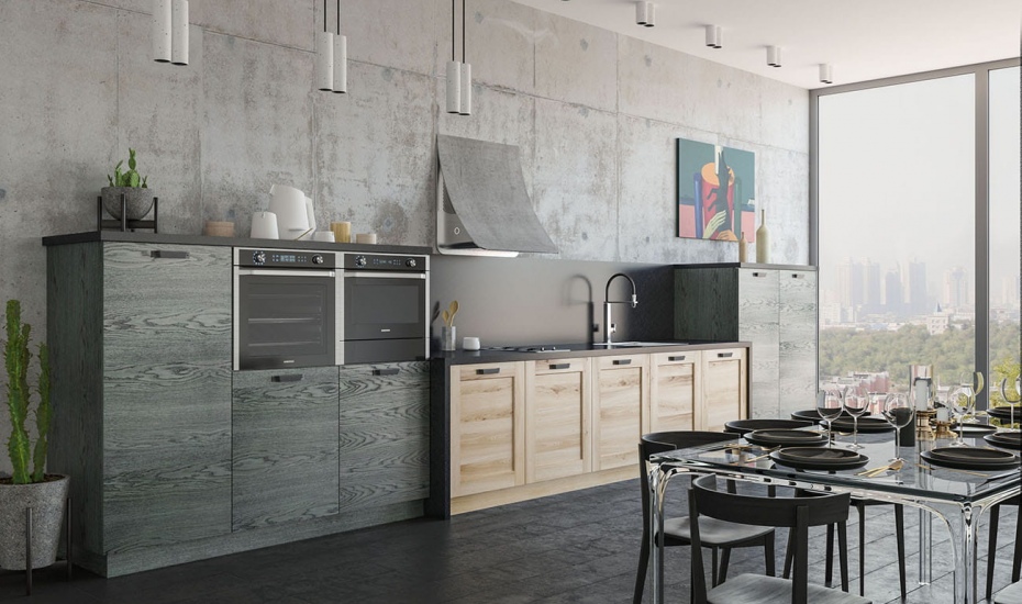 Комбинированные фасады, интегрированные ручки, механизм открывания нажатием.