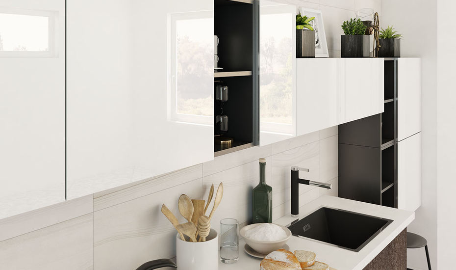 код 91552Компактная стильная кухня с навесными полками и шкафчиками.