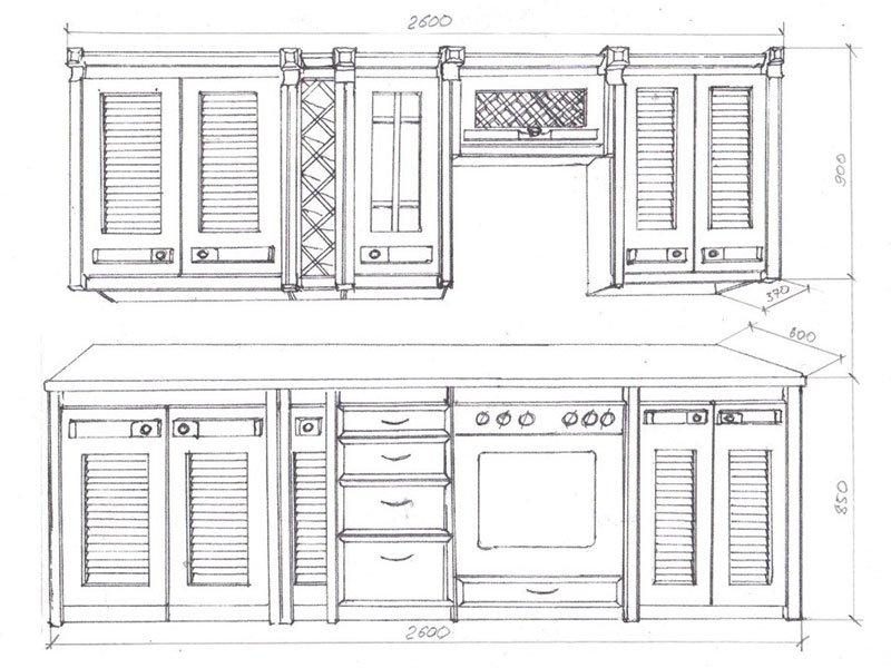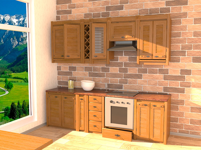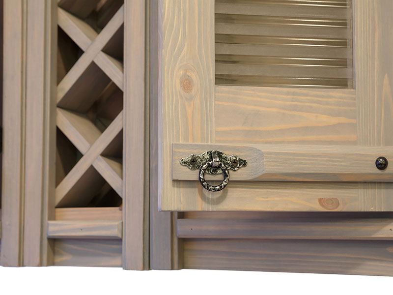 Деревянные фасады жалюзи. В зависимости от выбранных модулей комплектации могут присутствовать бутылочный и шкафчик-карго.