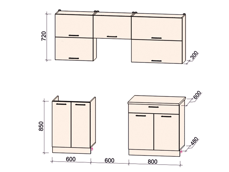 Фурнитура: дверные петли с доводчиками, шариковые направляющие полного выдвижения, мебельная опора, кухонные навесы, подъемник барный, ручка С-36, сушка для посуды.