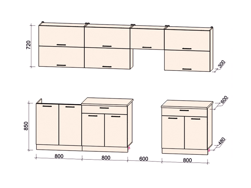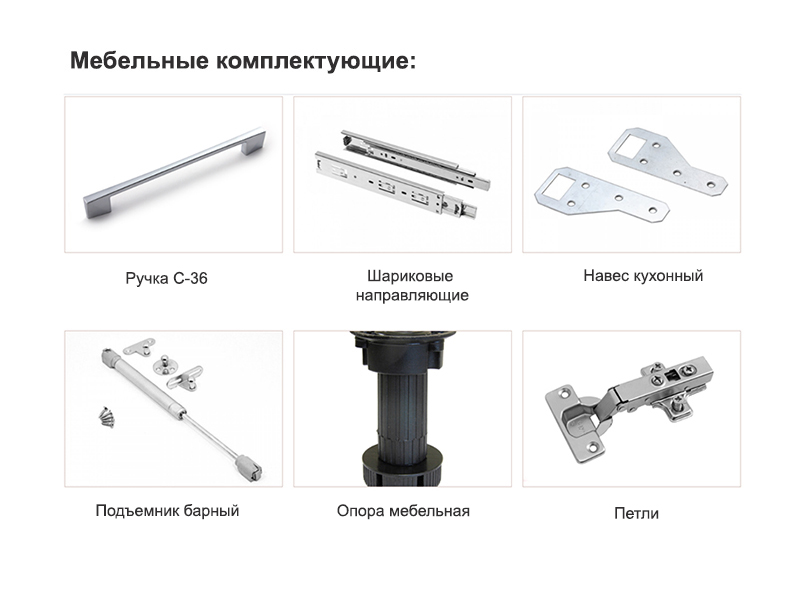 Фурнитура: дверные петли с доводчиками, шариковые направляющие полного выдвижения, мебельная опора, кухонные навесы, подъемник барный, ручка С-36, сушка для посуды.
