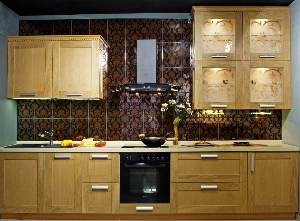 Сочетание коричневых тонов с металлической фурнитурой смотрится гармонично и стильно. Декорирует фасад матовое стекло с узорами на нем. За счет прямой формы изделие можно расположить в любом удобном месте.