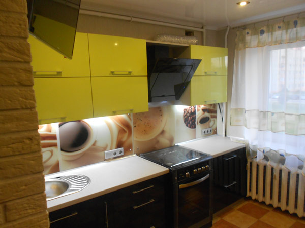Прямолинейная кухня исполнена в эффектном сочетании салатового и черного цвета. Глянцевая поверхность только подчеркивает привлекательный внешний вид. На стеклянные скинали нанесена фотопечать. Рабочая зона оснащена подсветкой.