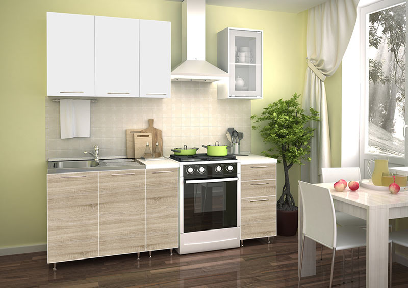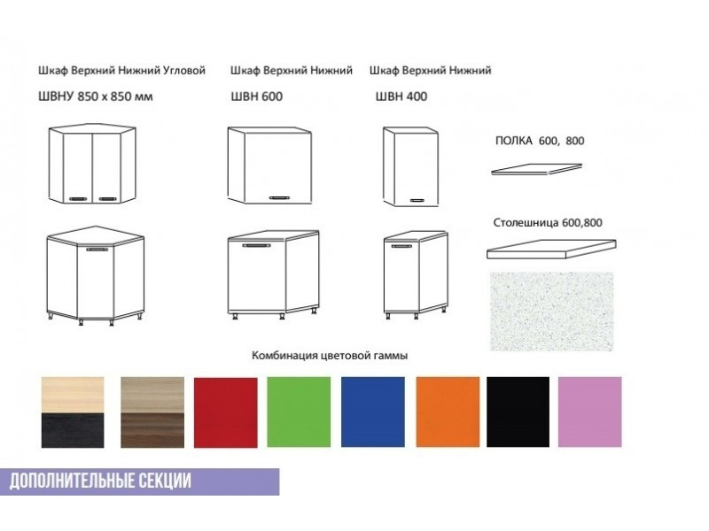 Любая готовая кухня 1.5 м., 1.8 м., 2.0 м., может комплектоваться дополнительными модулями: угловой модуль (ШВНУ) 850*850 мм, (ШВН) 600 мм, (ШВН) 400 мм, а также дополнительными полками и столешницами (для установки врезной мойки).