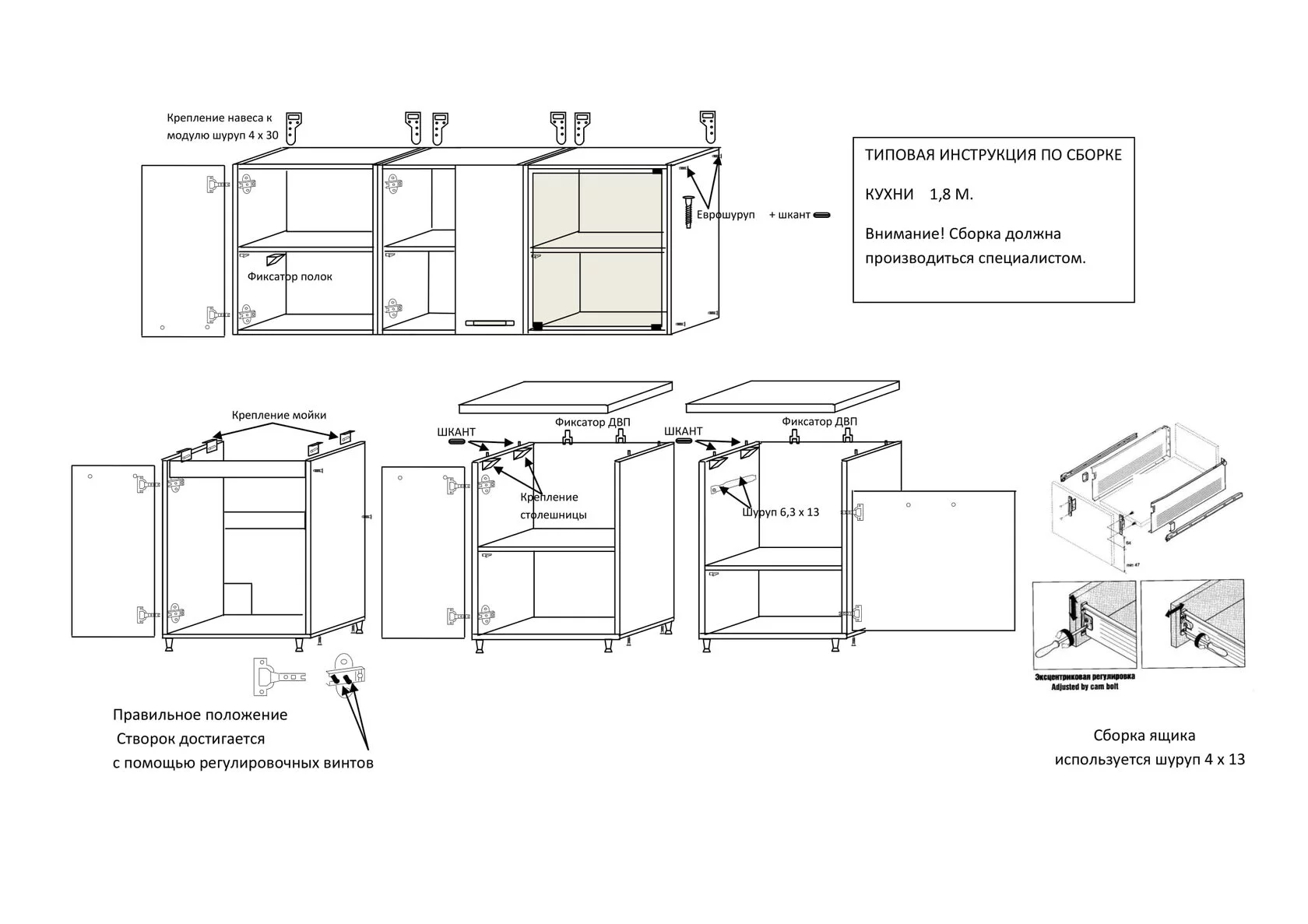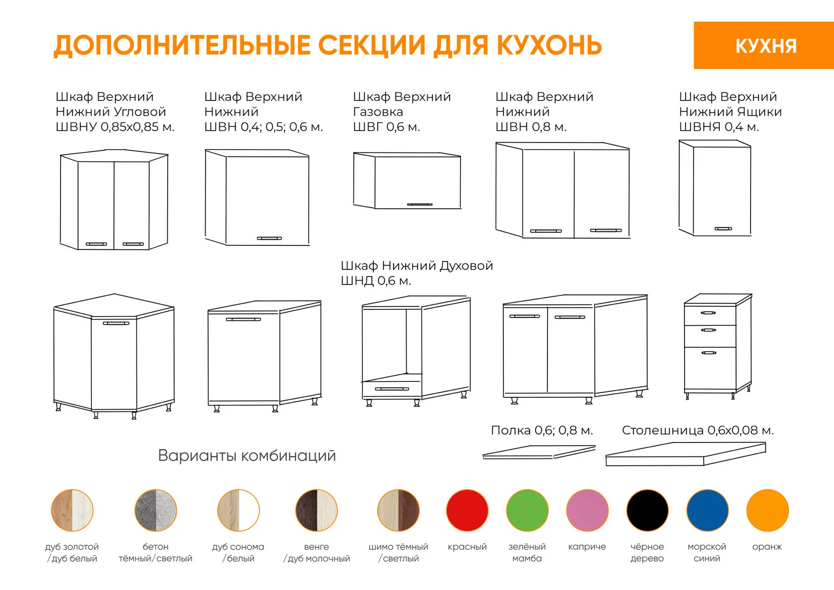 Любая готовая кухня 1.5 м., 1.8 м., 2.0 м., может комплектоваться дополнительными модулями: угловой модуль (ШВНУ) 850*850 мм, (ШВН) 600 мм, (ШВН) 400 мм, а также дополнительными полками и столешницами (для установки врезной мойки).