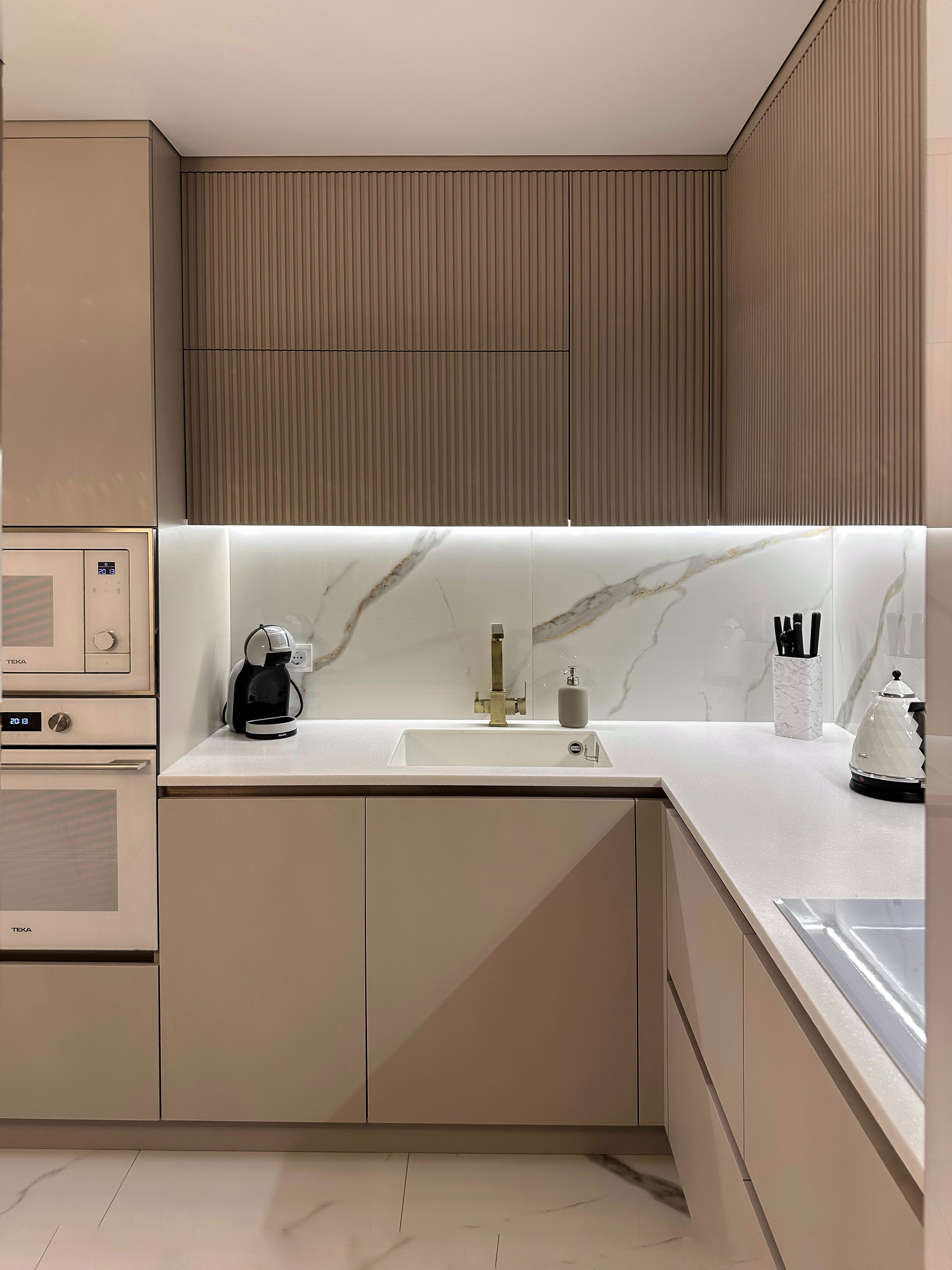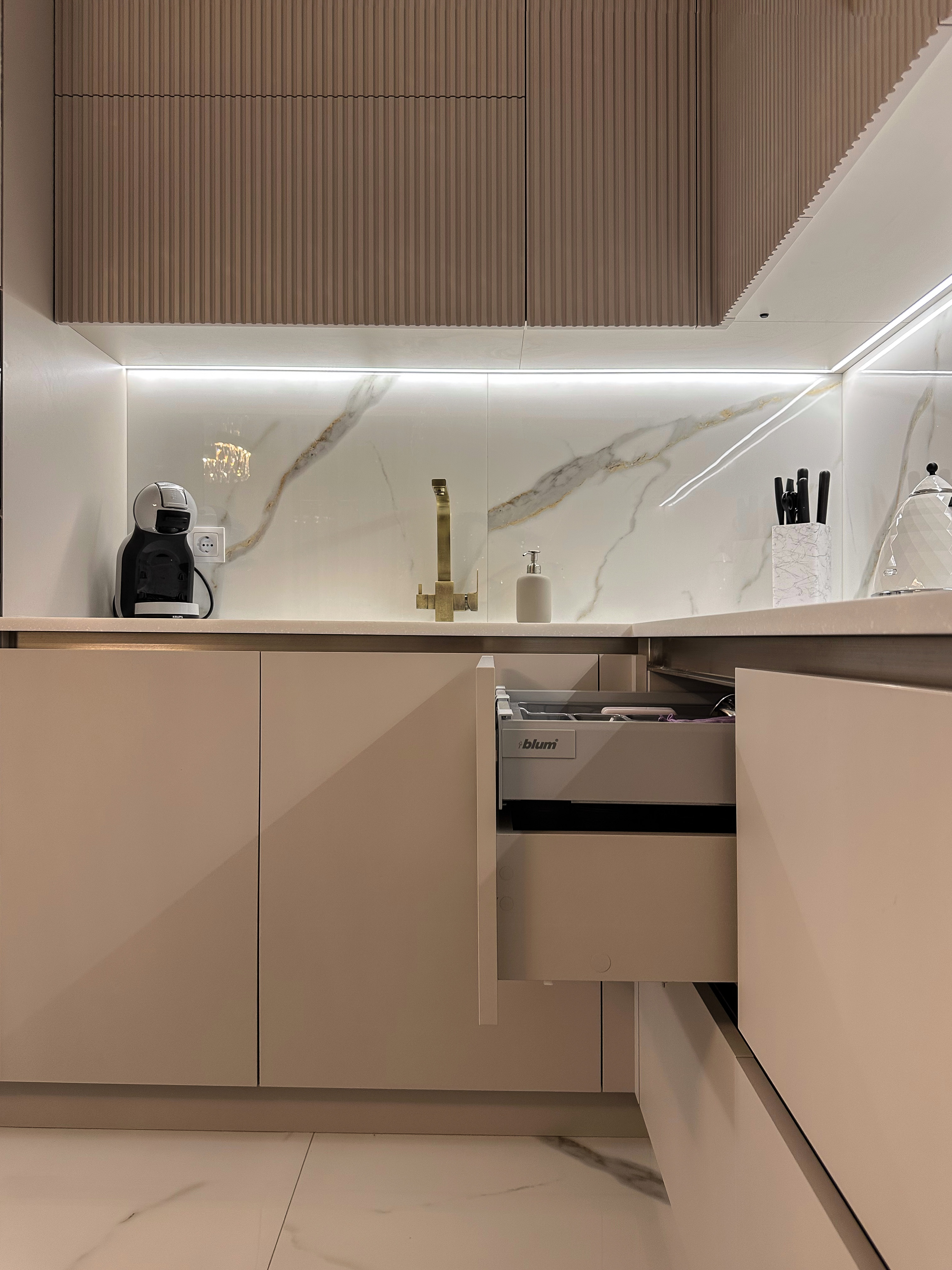 Элегантная кухня в тёплом бежевом оттенке с глянцевыми фасадами и благородной текстурой. Идеально подойдёт для интерьеров в стиле неоклассика, современная классика или минимализм с изюминкой. Изящная фрезеровка, мраморный фартук и золотая фурнитура создают ощущение уюта и роскоши.