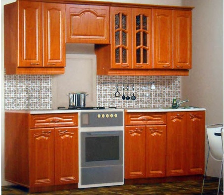 МДФ является очень прочным материалом, способствующим увеличению долговечности конструкции. Кухня выполнена в насыщенном древесном цвете.